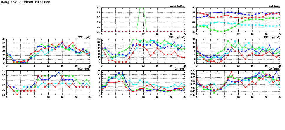 | Air Quality Data Time Series in Mong Kok (2022/06/22) | ( Line colors: Day -3 Day -2 Day -1 Current day ) | 2D Map Current AQHI |