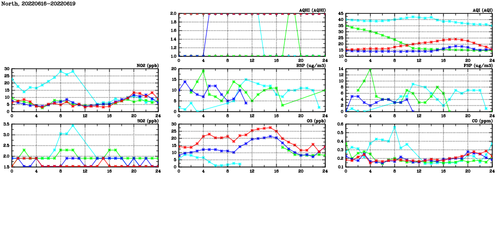 | Air Quality Data Time Series in North (2022/06/19) | ( Line colors: Day -3 Day -2 Day -1 Current day ) | 2D Map Current AQHI |