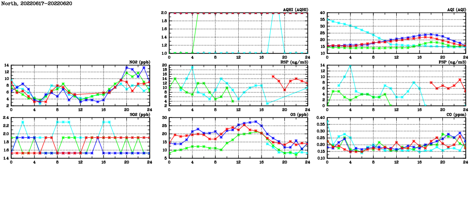 | Air Quality Data Time Series in North (2022/06/20) | ( Line colors: Day -3 Day -2 Day -1 Current day ) | 2D Map Current AQHI |