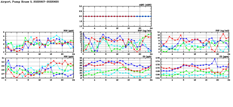 | Air Quality Data Time Series in Airport, Pump House 5 (2022/06/20) | ( Line colors: Day -3 Day -2 Day -1 Current day ) | 2D Map Current AQHI |