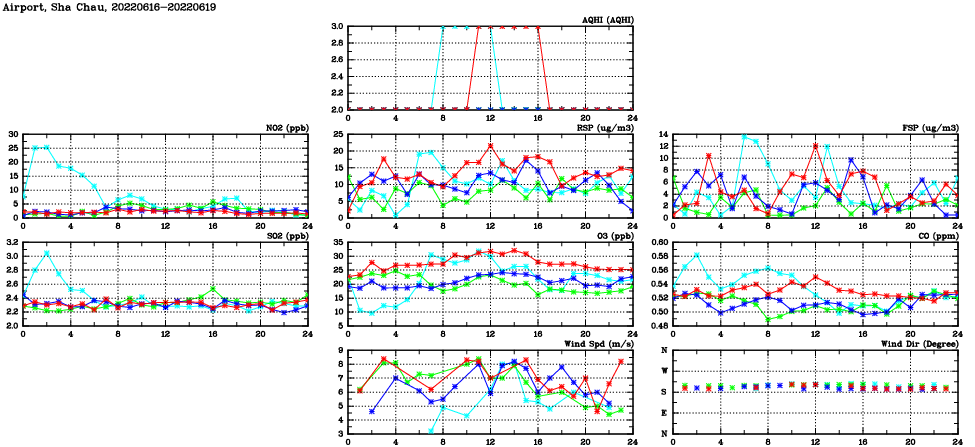 | Air Quality Data Time Series in Airport, Sha Chau (2022/06/19) | ( Line colors: Day -3 Day -2 Day -1 Current day ) | 2D Map Current AQHI |