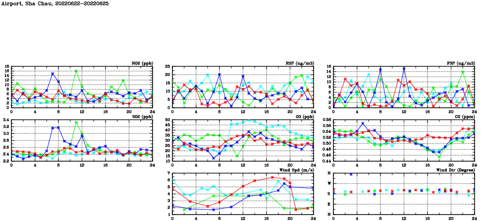 | Air Quality Data Time Series in Airport, Sha Chau (2022/06/25) | ( Line colors: Day -3 Day -2 Day -1 Current day ) | 2D Map Current AQHI |