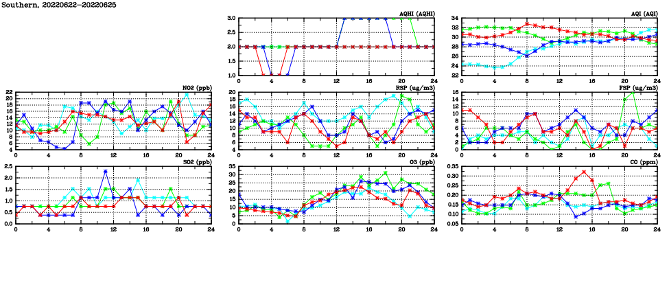 | Air Quality Data Time Series in Southern (2022/06/25) | ( Line colors: Day -3 Day -2 Day -1 Current day ) | 2D Map Current AQHI |