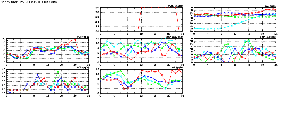 | Air Quality Data Time Series in Sham Shui Po (2022/06/23) | ( Line colors: Day -3 Day -2 Day -1 Current day ) | 2D Map Current AQHI |