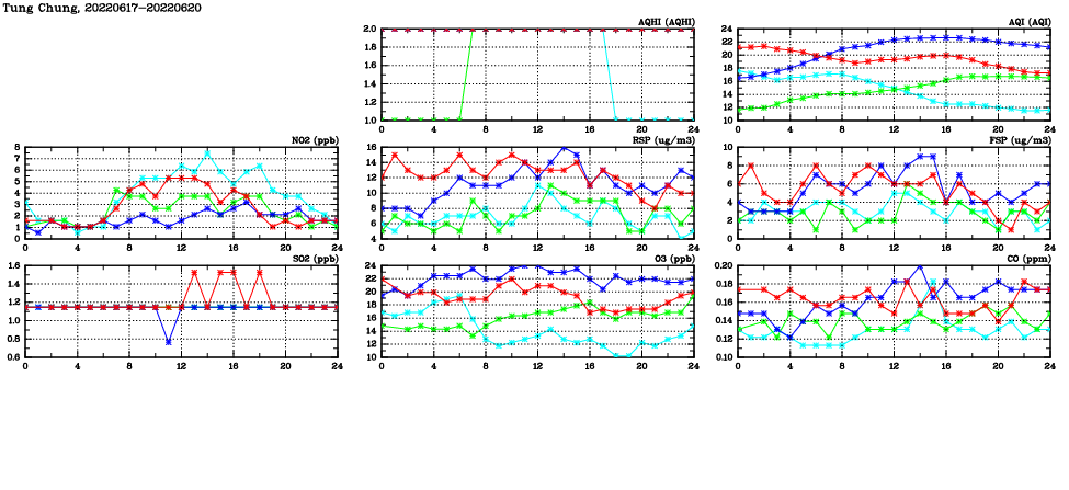 | Air Quality Data Time Series in Tung Chung (2022/06/20) | ( Line colors: Day -3 Day -2 Day -1 Current day ) | 2D Map Current AQHI |
