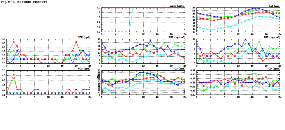 | Air Quality Data Time Series in Tap Mun (2022/06/21) | ( Line colors: Day -3 Day -2 Day -1 Current day ) | 2D Map Current AQHI |