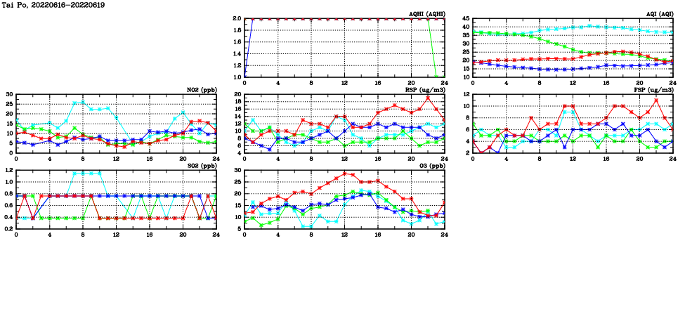 | Air Quality Data Time Series in Tai Po (2022/06/19) | ( Line colors: Day -3 Day -2 Day -1 Current day ) | 2D Map Current AQHI |