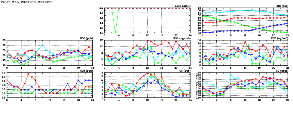 | Air Quality Data Time Series in Tsuen Wan (2022/06/19) | ( Line colors: Day -3 Day -2 Day -1 Current day ) | 2D Map Current AQHI |