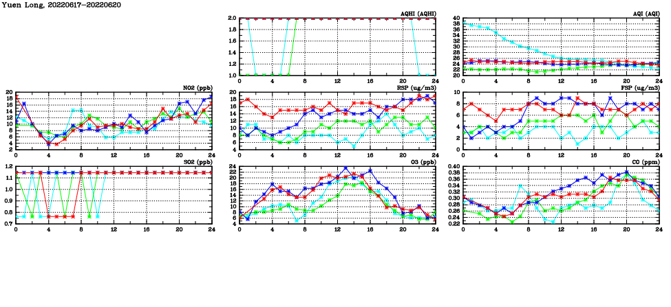 | Air Quality Data Time Series in Yuen Long (2022/06/20) | ( Line colors: Day -3 Day -2 Day -1 Current day ) | 2D Map Current AQHI |