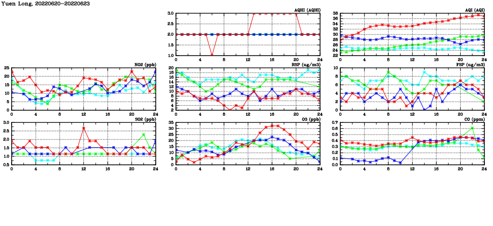 | Air Quality Data Time Series in Yuen Long (2022/06/23) | ( Line colors: Day -3 Day -2 Day -1 Current day ) | 2D Map Current AQHI |