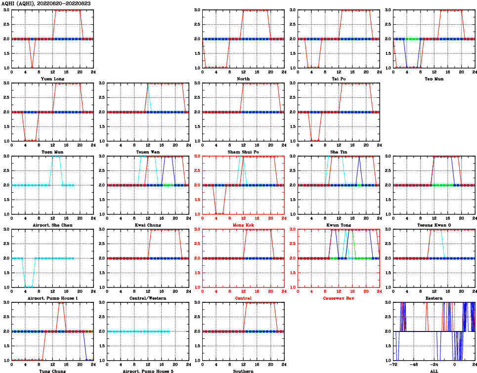| Air Quality Data Time Series for AQHI (2022/06/23) | ( Line colors: Day -3 Day -2 Day -1 Current day ) | 2D Map Current AQHI |