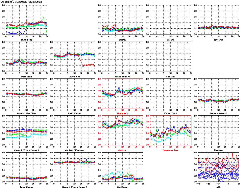 | Air Quality Data Time Series for CO (2022/06/23) | ( Line colors: Day -3 Day -2 Day -1 Current day ) | 2D Map Current AQHI |