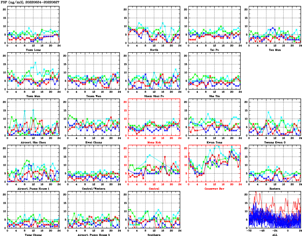 | Air Quality Data Time Series for FSP (2022/06/27) | ( Line colors: Day -3 Day -2 Day -1 Current day ) | 2D Map Current AQHI |