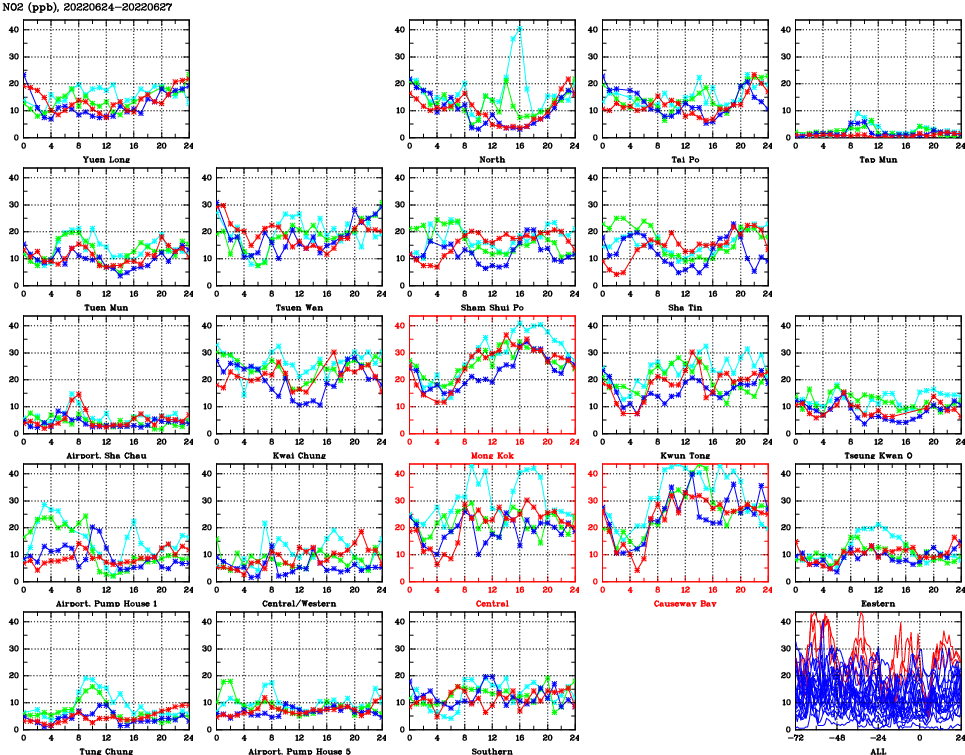 | Air Quality Data Time Series for NO2 (2022/06/27) | ( Line colors: Day -3 Day -2 Day -1 Current day ) | 2D Map Current AQHI |