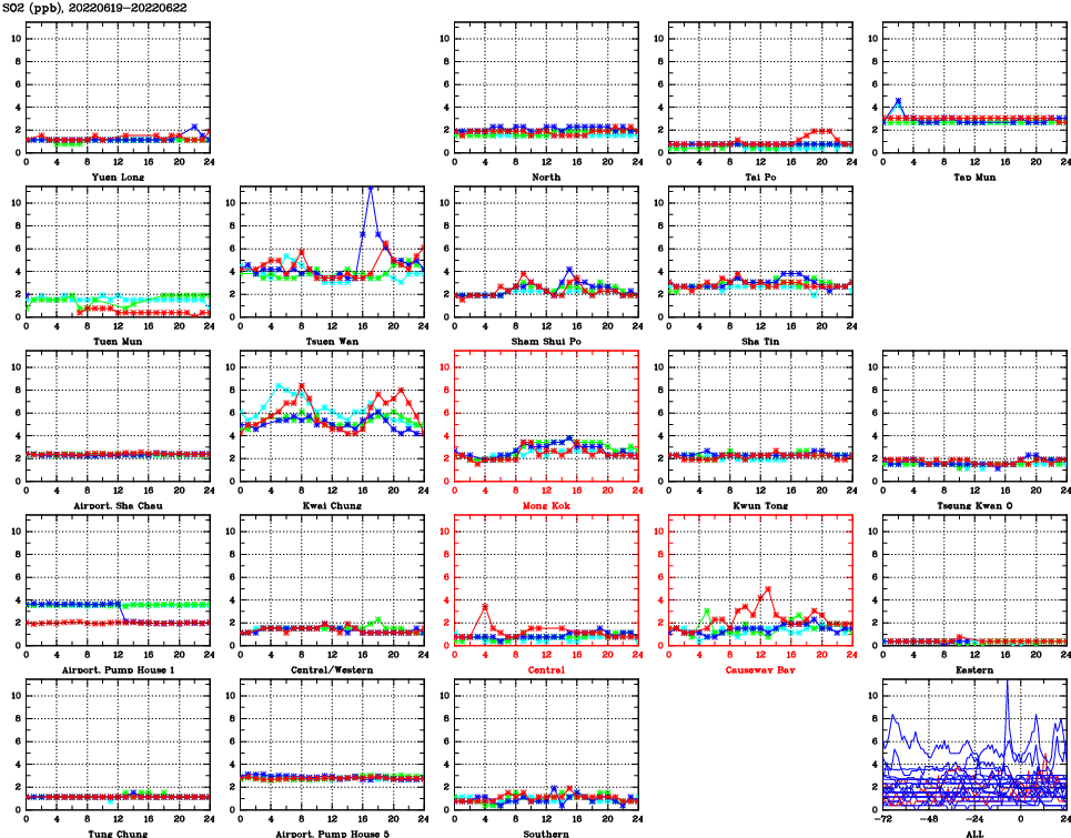 | Air Quality Data Time Series for SO2 (2022/06/22) | ( Line colors: Day -3 Day -2 Day -1 Current day ) | 2D Map Current AQHI |