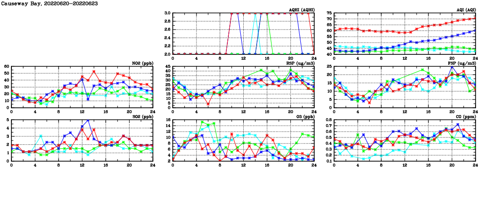 | Air Quality Data Time Series in Causeway Bay (2022/06/23) | ( Line colors: Day -3 Day -2 Day -1 Current day ) | 2D Map Current AQHI |