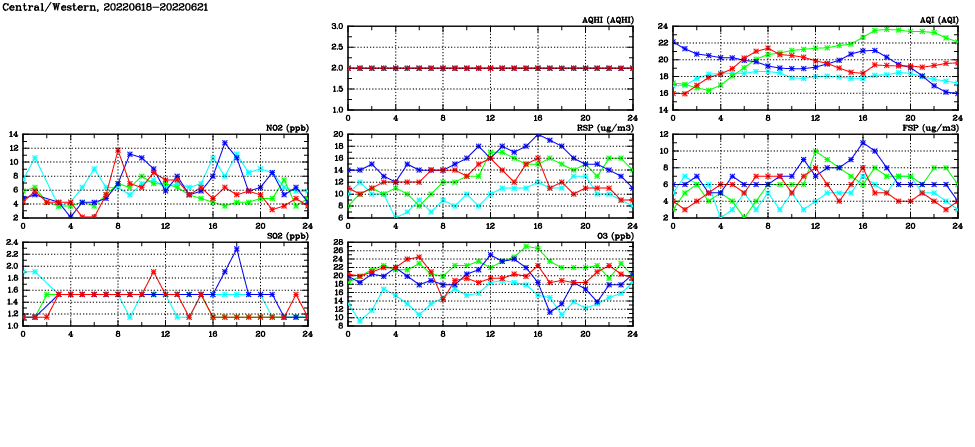 | Air Quality Data Time Series in Central/Western (2022/06/21) | ( Line colors: Day -3 Day -2 Day -1 Current day ) | 2D Map Current AQHI |