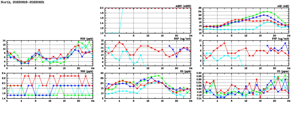 | Air Quality Data Time Series in North (2022/06/21) | ( Line colors: Day -3 Day -2 Day -1 Current day ) | 2D Map Current AQHI |