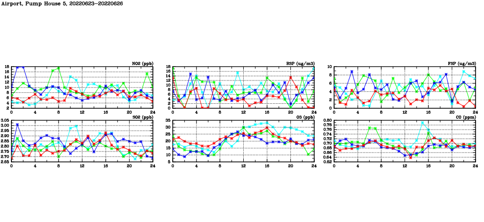 | Air Quality Data Time Series in Airport, Pump House 5 (2022/06/26) | ( Line colors: Day -3 Day -2 Day -1 Current day ) | 2D Map Current AQHI |