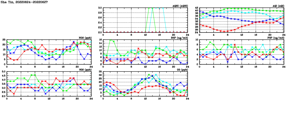 | Air Quality Data Time Series in Sha Tin (2022/06/27) | ( Line colors: Day -3 Day -2 Day -1 Current day ) | 2D Map Current AQHI |