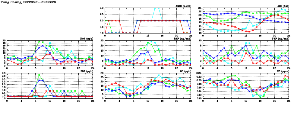 | Air Quality Data Time Series in Tung Chung (2022/06/26) | ( Line colors: Day -3 Day -2 Day -1 Current day ) | 2D Map Current AQHI |