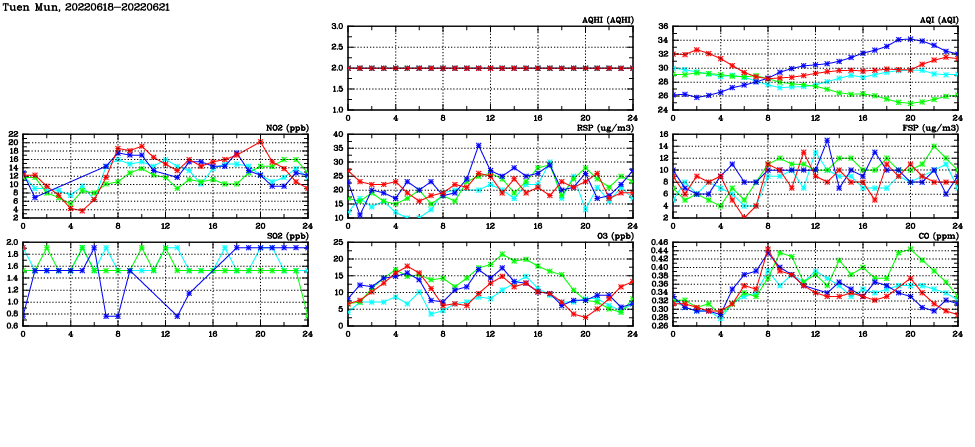 | Air Quality Data Time Series in Tuen Mun (2022/06/21) | ( Line colors: Day -3 Day -2 Day -1 Current day ) | 2D Map Current AQHI |