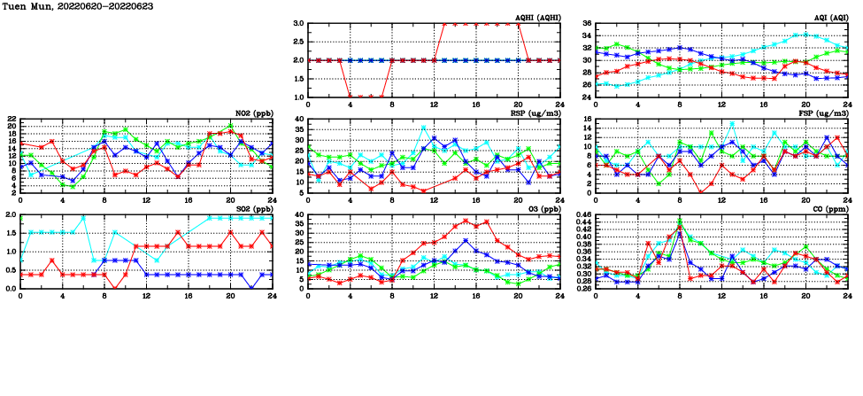 | Air Quality Data Time Series in Tuen Mun (2022/06/23) | ( Line colors: Day -3 Day -2 Day -1 Current day ) | 2D Map Current AQHI |