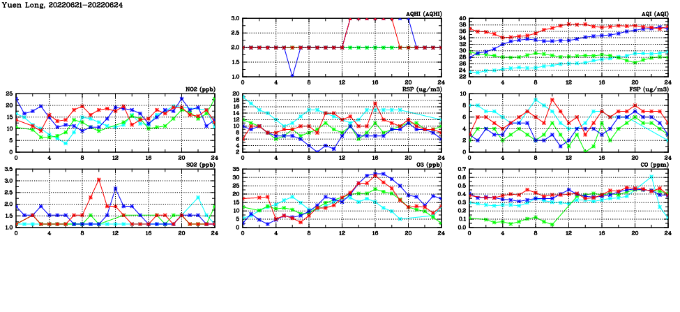 | Air Quality Data Time Series in Yuen Long (2022/06/24) | ( Line colors: Day -3 Day -2 Day -1 Current day ) | 2D Map Current AQHI |