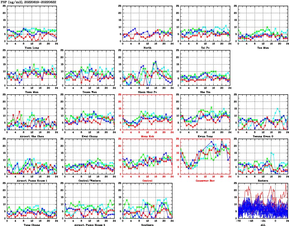 | Air Quality Data Time Series for FSP (2022/06/22) | ( Line colors: Day -3 Day -2 Day -1 Current day ) | 2D Map Current AQHI |