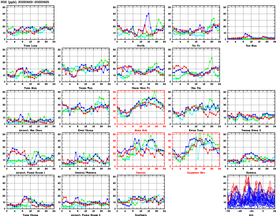 | Air Quality Data Time Series for NO2 (2022/06/25) | ( Line colors: Day -3 Day -2 Day -1 Current day ) | 2D Map Current AQHI |