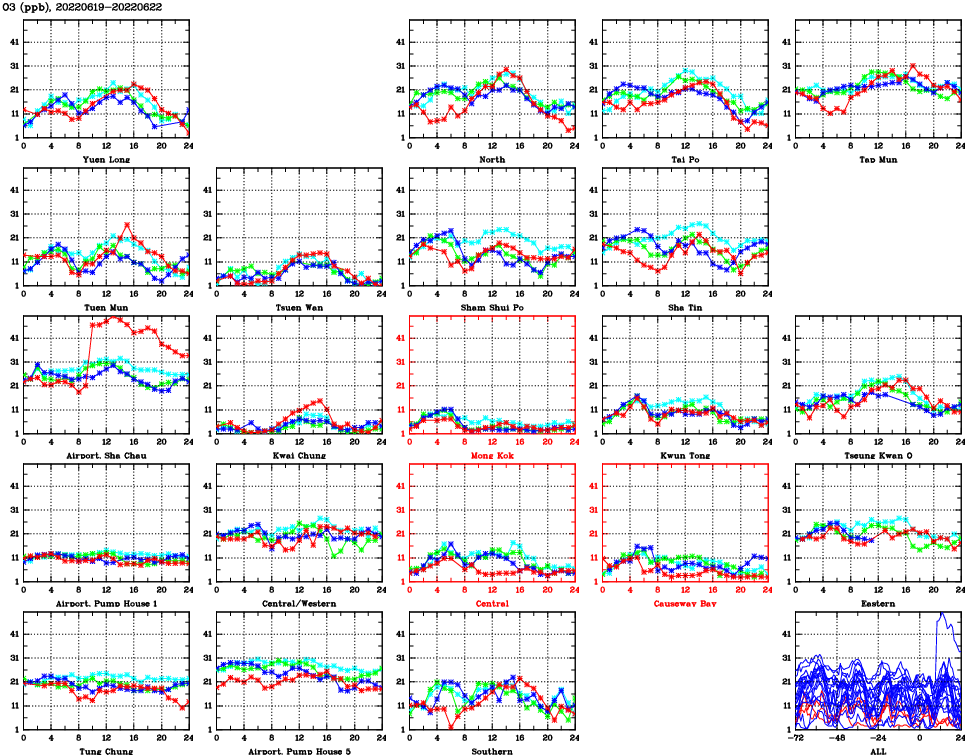| Air Quality Data Time Series for O3 (2022/06/22) | ( Line colors: Day -3 Day -2 Day -1 Current day ) | 2D Map Current AQHI |