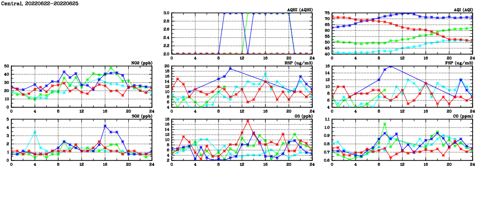 | Air Quality Data Time Series in Central (2022/06/25) | ( Line colors: Day -3 Day -2 Day -1 Current day ) | 2D Map Current AQHI |