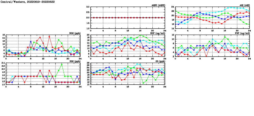 | Air Quality Data Time Series in Central/Western (2022/06/22) | ( Line colors: Day -3 Day -2 Day -1 Current day ) | 2D Map Current AQHI |