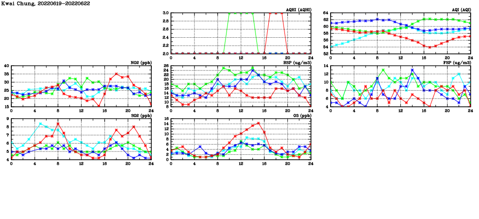 | Air Quality Data Time Series in Kwai Chung (2022/06/22) | ( Line colors: Day -3 Day -2 Day -1 Current day ) | 2D Map Current AQHI |