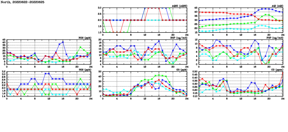 | Air Quality Data Time Series in North (2022/06/25) | ( Line colors: Day -3 Day -2 Day -1 Current day ) | 2D Map Current AQHI |