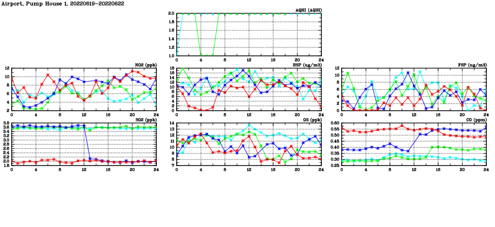 | Air Quality Data Time Series in Airport, Pump House 1 (2022/06/22) | ( Line colors: Day -3 Day -2 Day -1 Current day ) | 2D Map Current AQHI |
