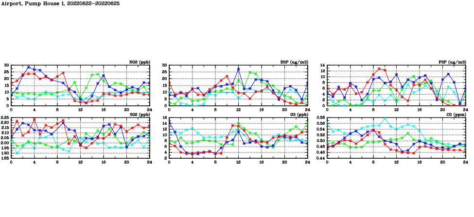 | Air Quality Data Time Series in Airport, Pump House 1 (2022/06/25) | ( Line colors: Day -3 Day -2 Day -1 Current day ) | 2D Map Current AQHI |
