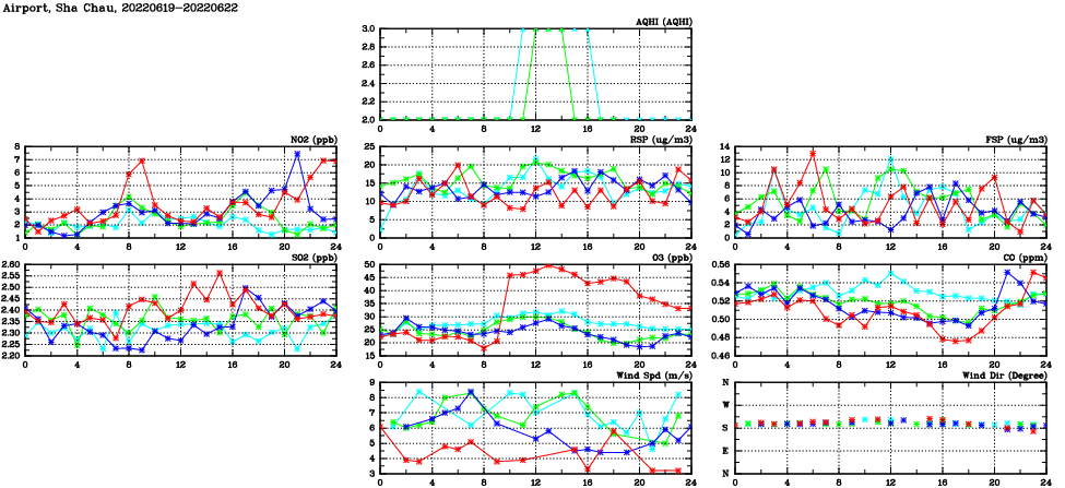 | Air Quality Data Time Series in Airport, Sha Chau (2022/06/22) | ( Line colors: Day -3 Day -2 Day -1 Current day ) | 2D Map Current AQHI |