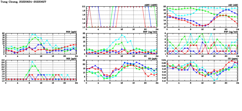 | Air Quality Data Time Series in Tung Chung (2022/06/27) | ( Line colors: Day -3 Day -2 Day -1 Current day ) | 2D Map Current AQHI |