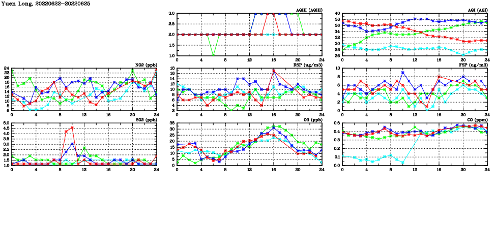 | Air Quality Data Time Series in Yuen Long (2022/06/25) | ( Line colors: Day -3 Day -2 Day -1 Current day ) | 2D Map Current AQHI |