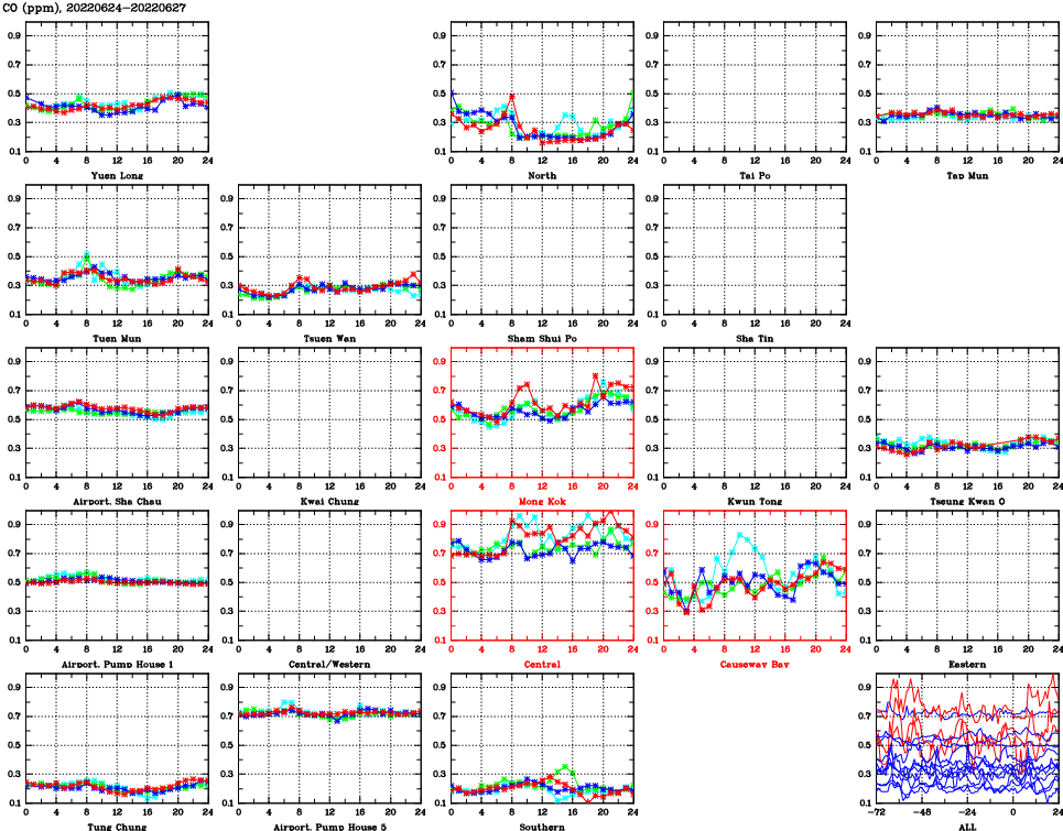 | Air Quality Data Time Series for CO (2022/06/27) | ( Line colors: Day -3 Day -2 Day -1 Current day ) | 2D Map Current AQHI |