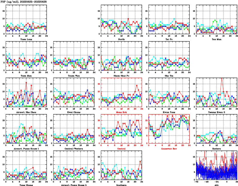| Air Quality Data Time Series for FSP (2022/06/28) | ( Line colors: Day -3 Day -2 Day -1 Current day ) | 2D Map Current AQHI |