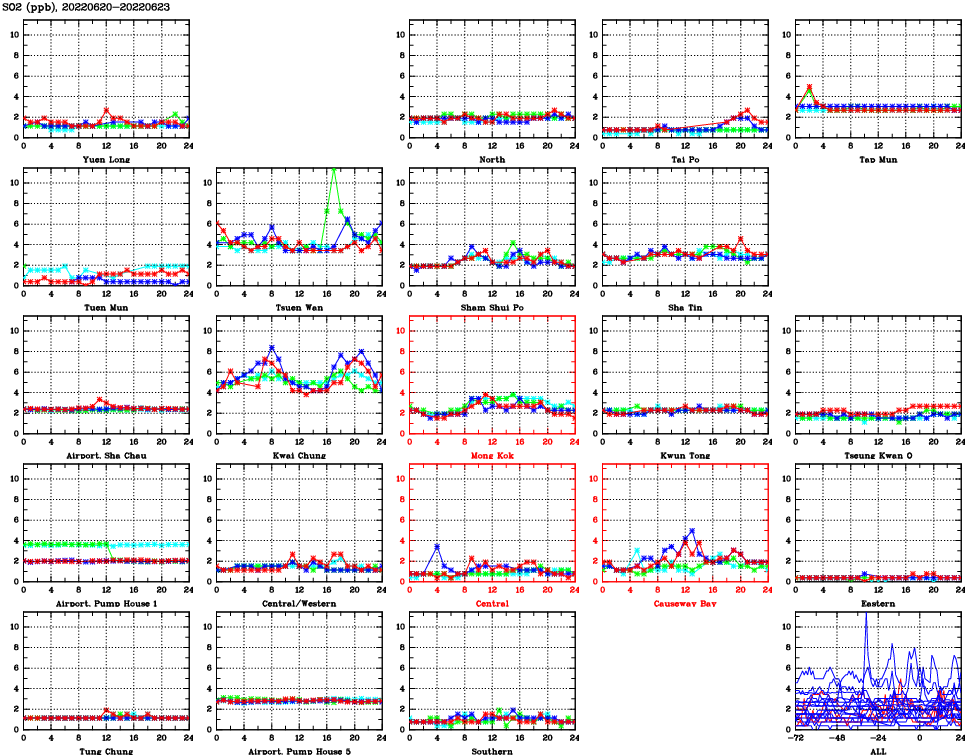 | Air Quality Data Time Series for SO2 (2022/06/23) | ( Line colors: Day -3 Day -2 Day -1 Current day ) | 2D Map Current AQHI |
