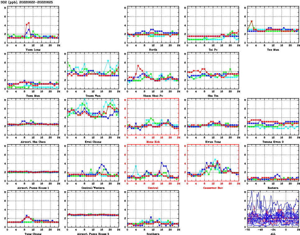 | Air Quality Data Time Series for SO2 (2022/06/25) | ( Line colors: Day -3 Day -2 Day -1 Current day ) | 2D Map Current AQHI |