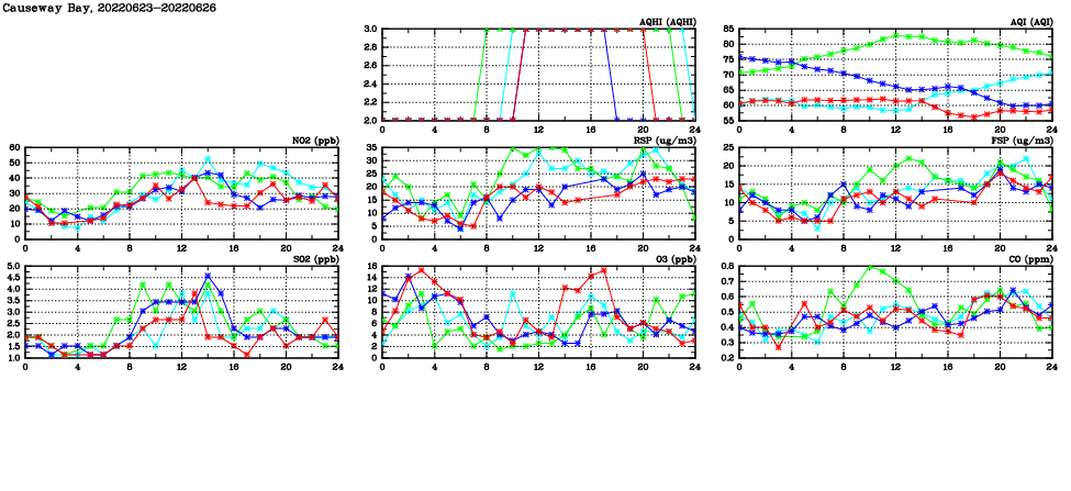 | Air Quality Data Time Series in Causeway Bay (2022/06/26) | ( Line colors: Day -3 Day -2 Day -1 Current day ) | 2D Map Current AQHI |