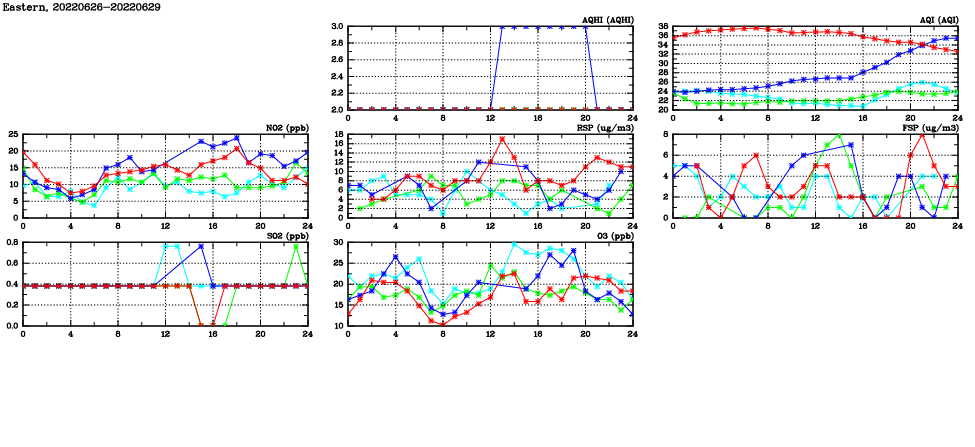 | Air Quality Data Time Series in Eastern (2022/06/29) | ( Line colors: Day -3 Day -2 Day -1 Current day ) | 2D Map Current AQHI |