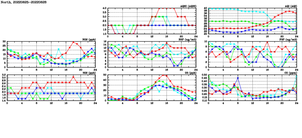 | Air Quality Data Time Series in North (2022/06/28) | ( Line colors: Day -3 Day -2 Day -1 Current day ) | 2D Map Current AQHI |