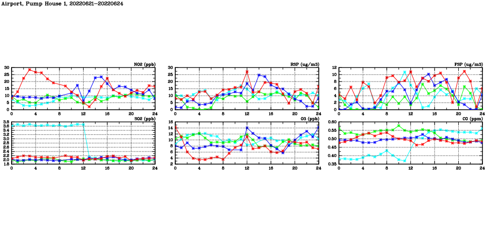| Air Quality Data Time Series in Airport, Pump House 1 (2022/06/24) | ( Line colors: Day -3 Day -2 Day -1 Current day ) | 2D Map Current AQHI |
