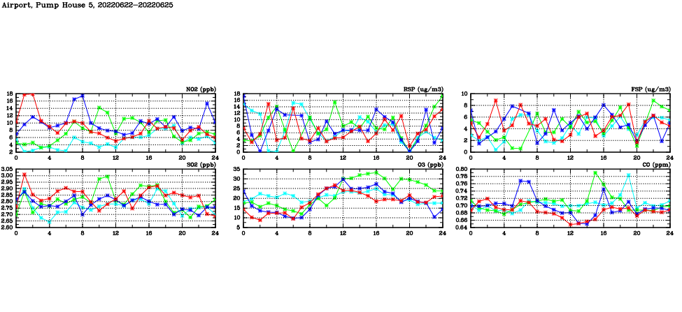 | Air Quality Data Time Series in Airport, Pump House 5 (2022/06/25) | ( Line colors: Day -3 Day -2 Day -1 Current day ) | 2D Map Current AQHI |