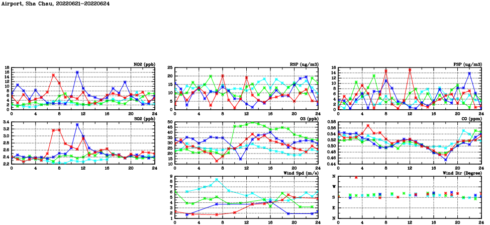 | Air Quality Data Time Series in Airport, Sha Chau (2022/06/24) | ( Line colors: Day -3 Day -2 Day -1 Current day ) | 2D Map Current AQHI |